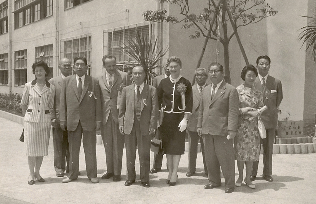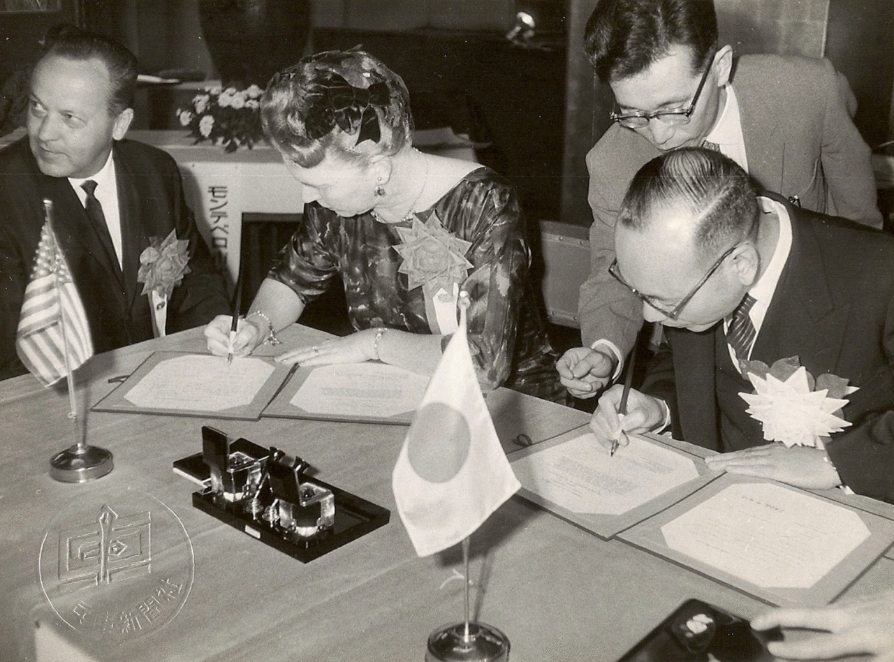 May 1961, Ashiya, Japan, Montebello City Councilwoman Elaine Kirchner signed the Sister City Agreement with Ashiya Mayor Watanabe.